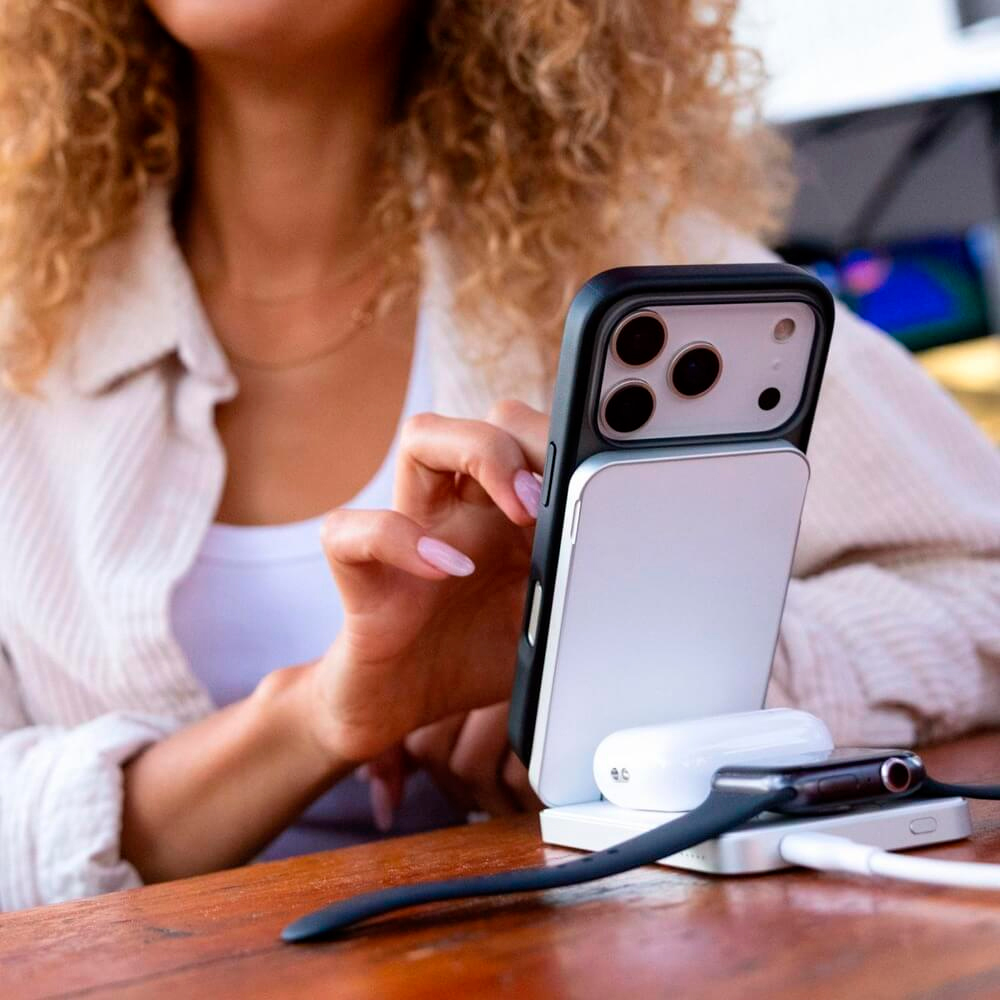 Компактный внешний аккумулятор с магнитной фиксацией для iPhone. Заряжает по MagSafe, работает с Qi‑устройствами и поддерживает проводную зарядку через USB‑C.