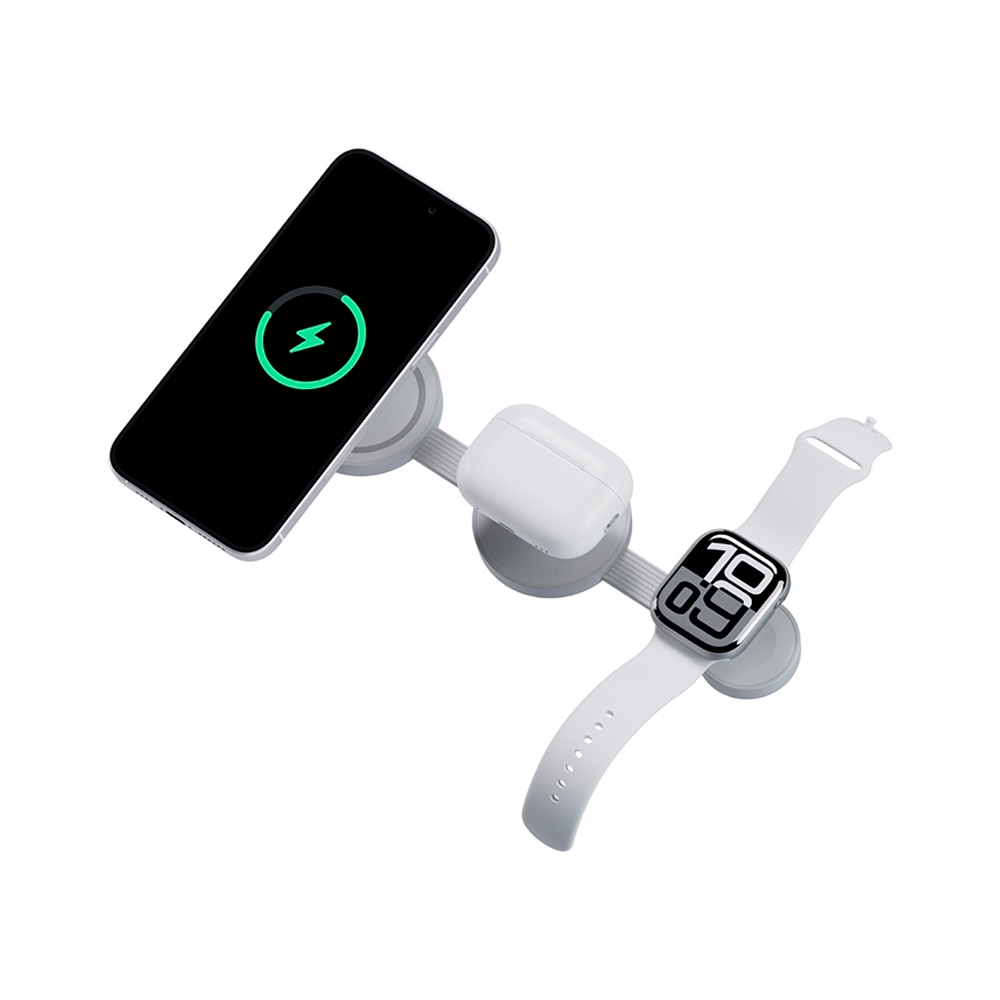 Складная магнитная беспроводная станция на три устройства: iPhone/смартфон с Qi, Apple Watch и кейс наушников (AirPods и др.). Компактный формат для дома, рабочего стола и поездок, аккуратный серый цвет, вход USB‑C.