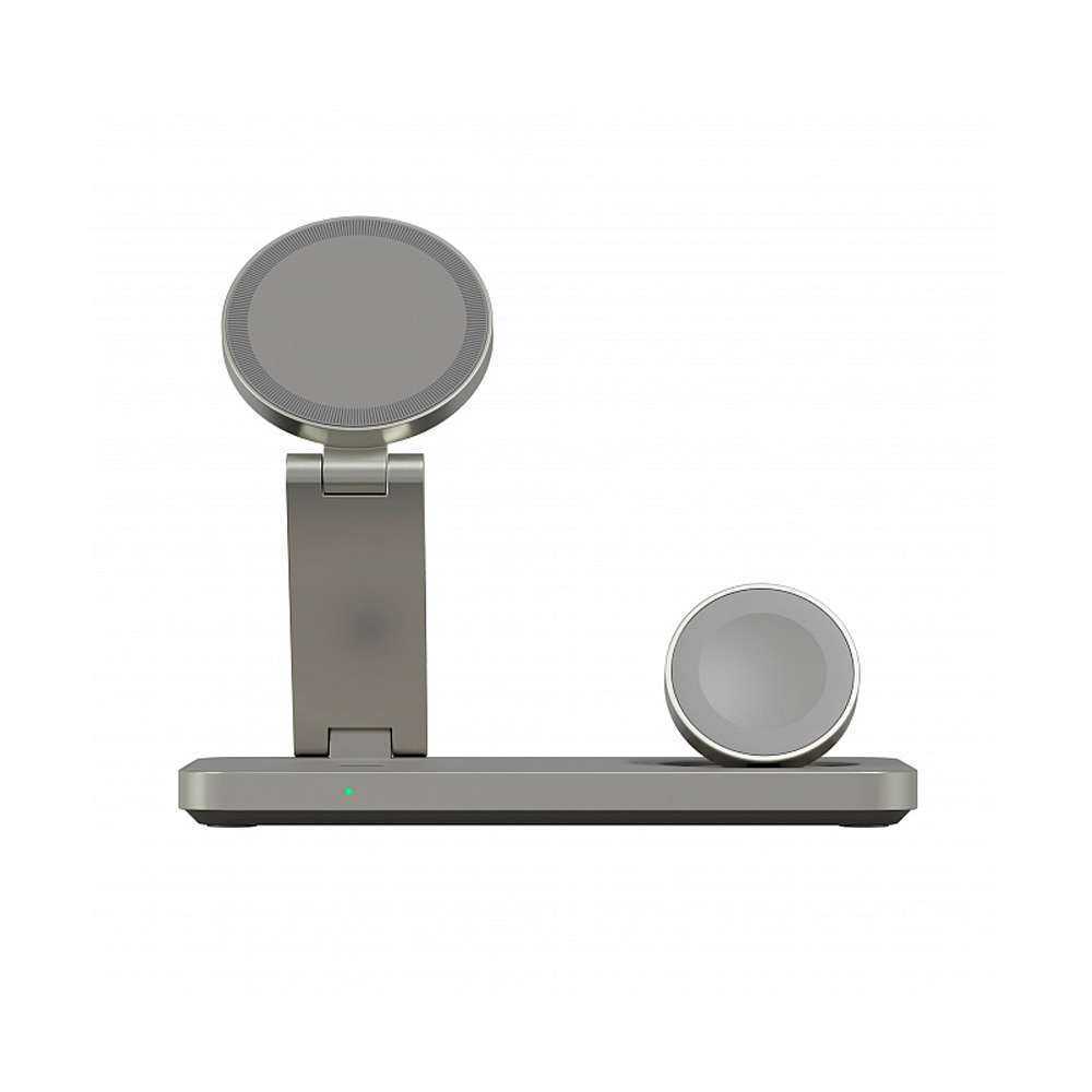 Складная беспроводная станция для одновременной зарядки iPhone, Apple Watch и наушников с поддержкой Qi. Магниты выравнивают iPhone на площадке, конструкция «йога» складывается для поездок и работает как подставка на столе.