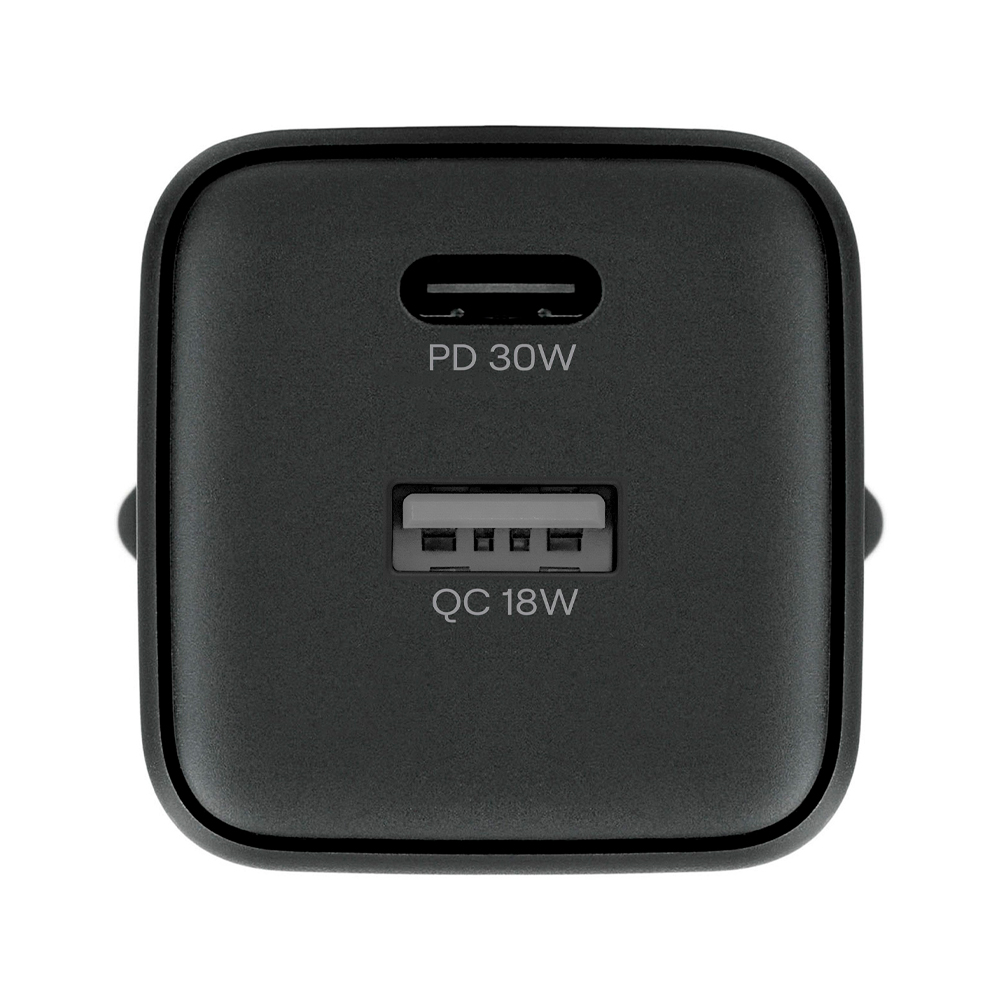 - 2 порта: USB‑C (USB Power Delivery до 30 Вт) и USB‑A — один адаптер для двух устройств.
