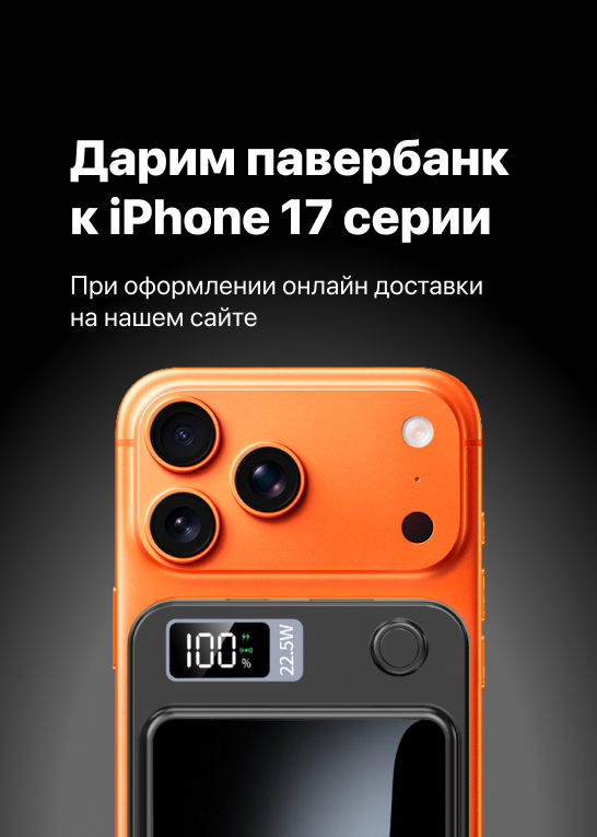 При покупке iPhone 17, 17 Pro, 17 Pro Max и Air любого цвета и объема памяти с доставкой — вы получаете пауэрбанк на 5000 мАч с удобным подключением через MagSafe в подарок.Акция действует только при оформлении доставки. Самовывоз в нее не входит.